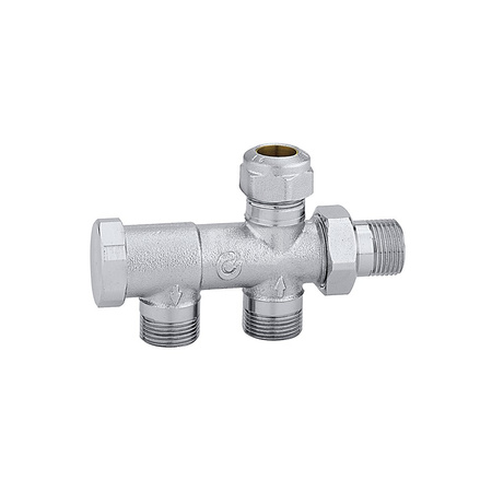 Zawór grzejnikowy do instalacji jednorurowych Z przyłączem do elementu łączącego Element łączący Ø 15 mm (seria 454) Przyłącza podłogowe. Natężenie przepływu do grzejnika: 50%. podłącznie rury: 23 p. 1,5, wlot, Podłączenie do złączek Caleffi. podłączenie grzejnika: 23 p. 1,5, wylot. Maksymalne ciśnienie pracy: 10 bar. Zakres temperatury medium: 5–100 °C. Rozstaw przyłączy głównych: 40 mm. Wykończenie: chromowane. Kv: 2,2 m³/h. Materiał: mosiądz.