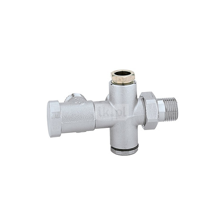 Zawór grzejnikowych do instalacji jednorurowych Z szablonem naściennym, rozetą maskującą i przyłączem elementu łączącego. Element łączący Ø 15 mm (seria 454). Natężenie przepływu do grzejnika: 50%. podłącznie rury: 23 p. 1,5, wlot, Podłączenie do złączek Caleffi. podłączenie grzejnika: G 1/2" A (ISO 228-1) GZ, wylot. Maksymalne ciśnienie pracy: 10 bar. Zakres temperatury medium: 5–100 °C. Rozstaw przyłączy głównych: 40 mm. Wykończenie: chromowane. Kv: 2,2 m³/h. Materiał: mosiądz.