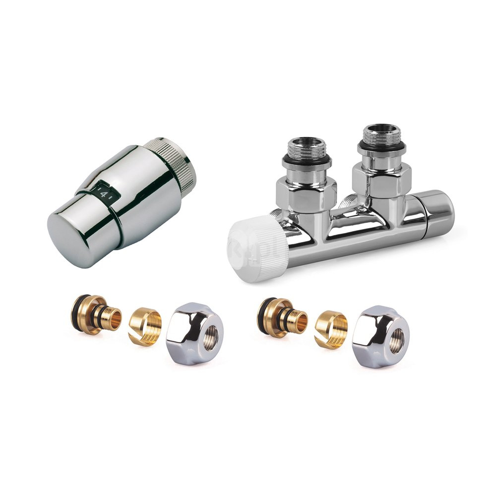 Zestaw CHROM do grzejników dolnozasilanych: głowica Thera-200 (chrom/chrom) T4221, zawór podwójny, kątowy lewy, V2882LSL15A + 2x złączka do rur wielowarstwowych FEM24M16X2