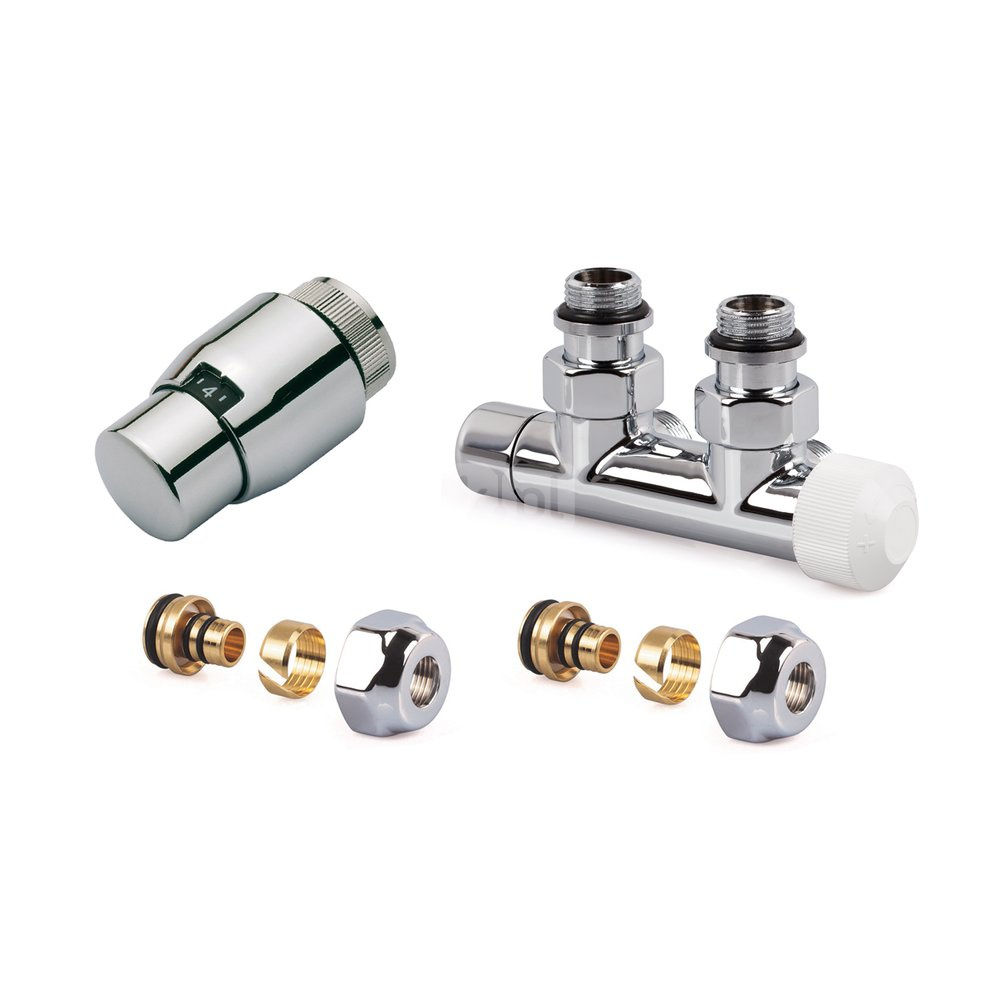 Zestaw CHROM do grzejników dolnozasilanych: głowica Thera-200 (chrom/chrom) T4221, zawór podwójny, kątowy prawy, V2882RSL15A + 2x złączka do rur wielowarstwowych FEM24M16X2
