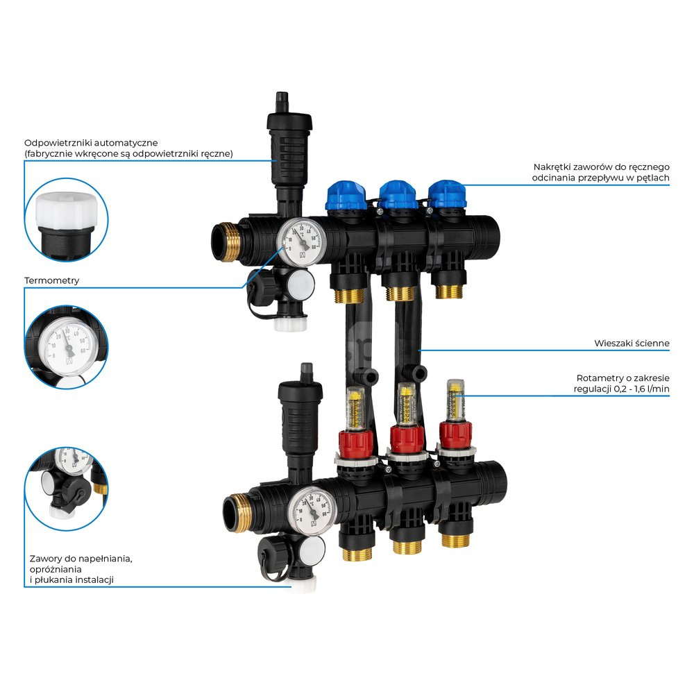 - Rozprowadza ciepło/chłód ze źródła na poszczególne pętle instalacji płaszczyznowej.