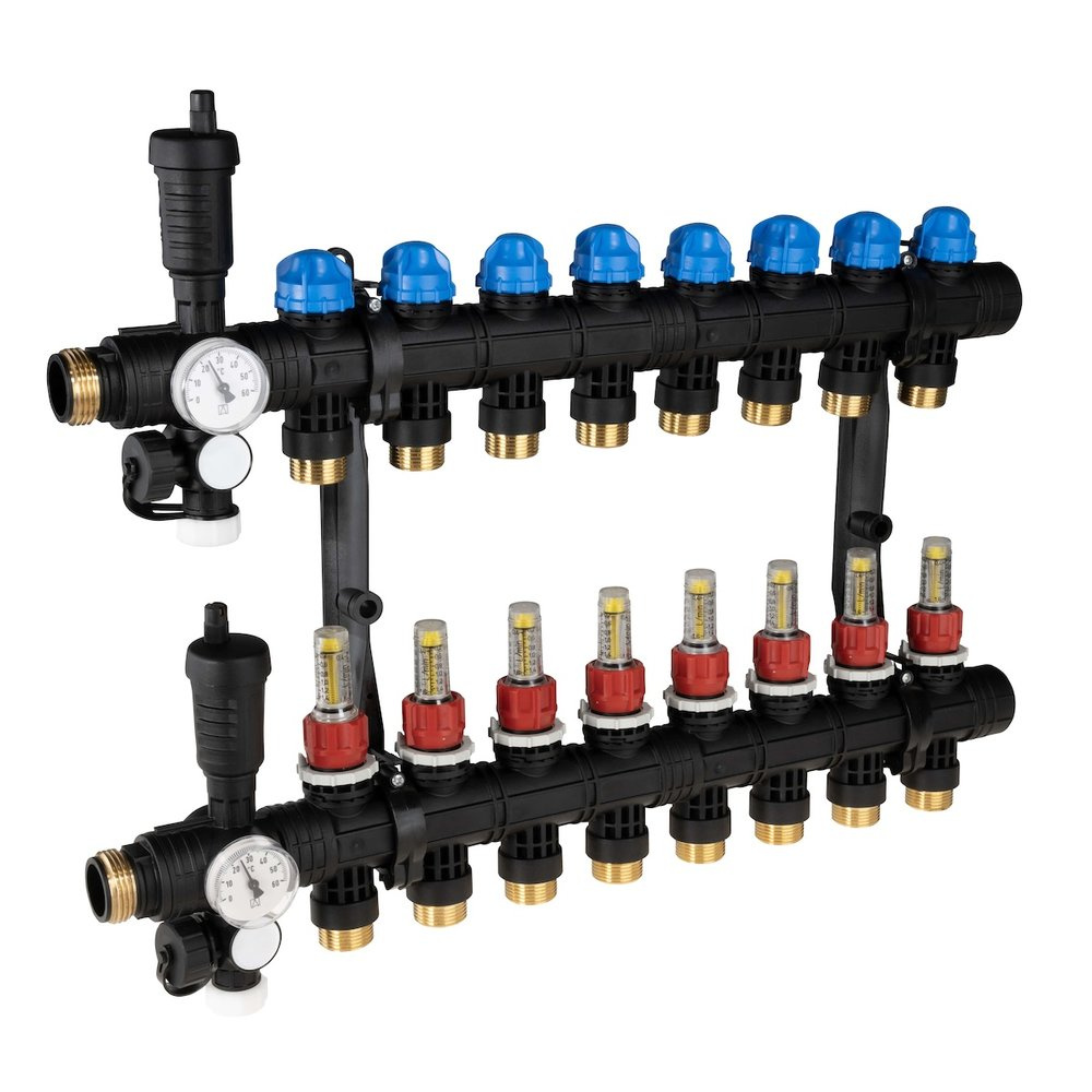 - Rozprowadza ciepło/chłód ze źródła na poszczególne pętle instalacji płaszczyznowej.