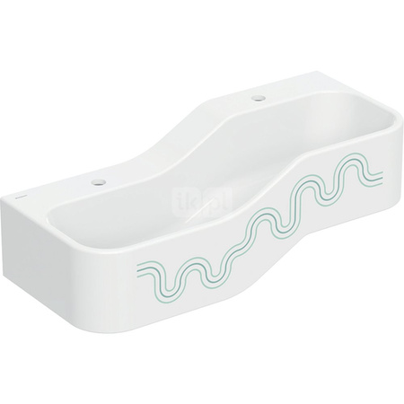 Umywalka GEBERIT Bambini 2-stanowiskowa prostokątna (rynna, elementy dekoracyjne: zielony / jasnozielony), biała, 900mm, otwór na baterię na środku (x2), bez odpływu przelewowego, półka od ściany