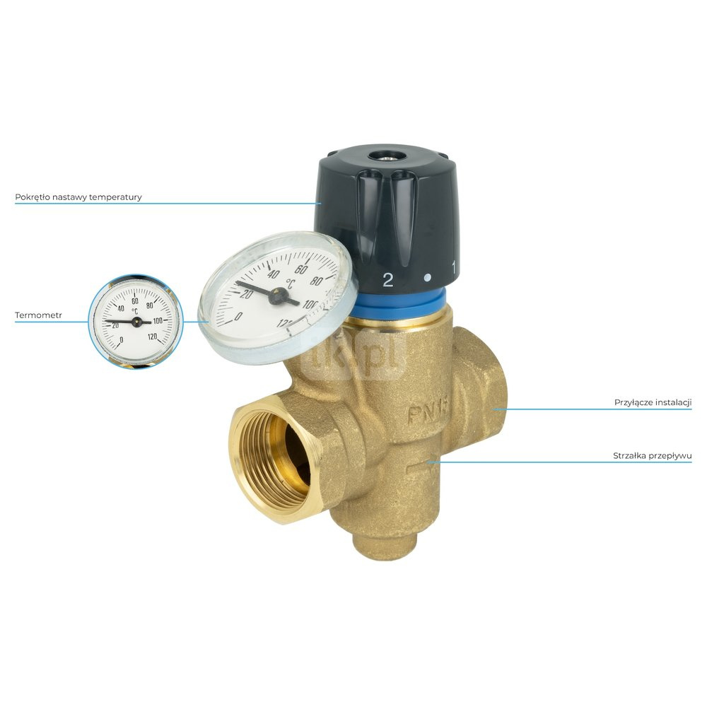 - Termometr o zakresie pomiarowym 0÷120° umożliwia kontrolę aktualnej temperatury wody.
